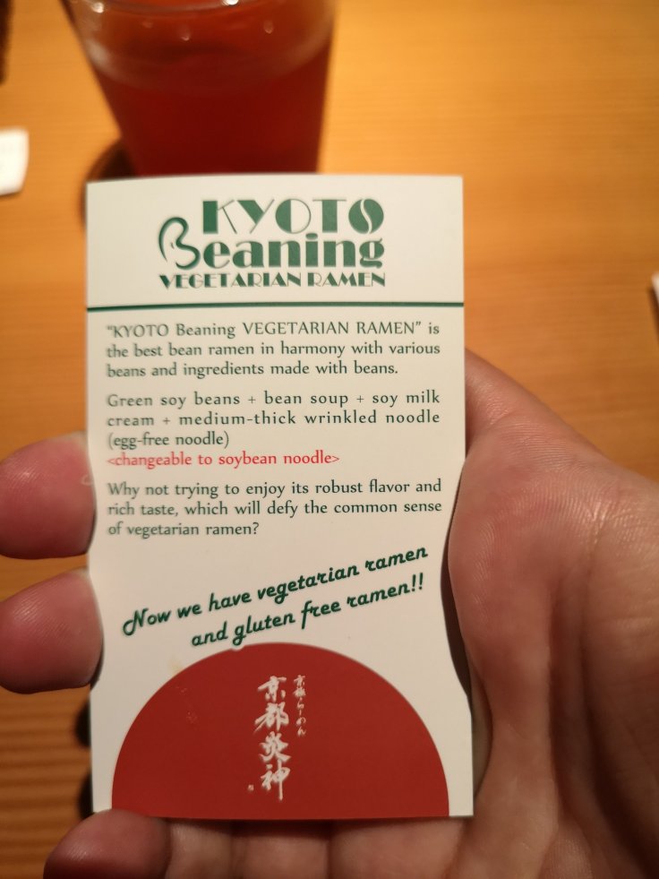 Vom Hunger getrieben sind wir zurück nach Kyoto, und da unser Daniel ja an einer Glutenallergie leidet, ist es immer etwas schwierig ein passendes Lokal zu finden. Diesmal waren wir in einem glutenfreien Ramenladen. Es war einfach köstlich. Sie bieten dort vegetarisch, vegan, glutenfrei und auch mit Fleisch und Gluten an. Es ist für jeden was dabei.
