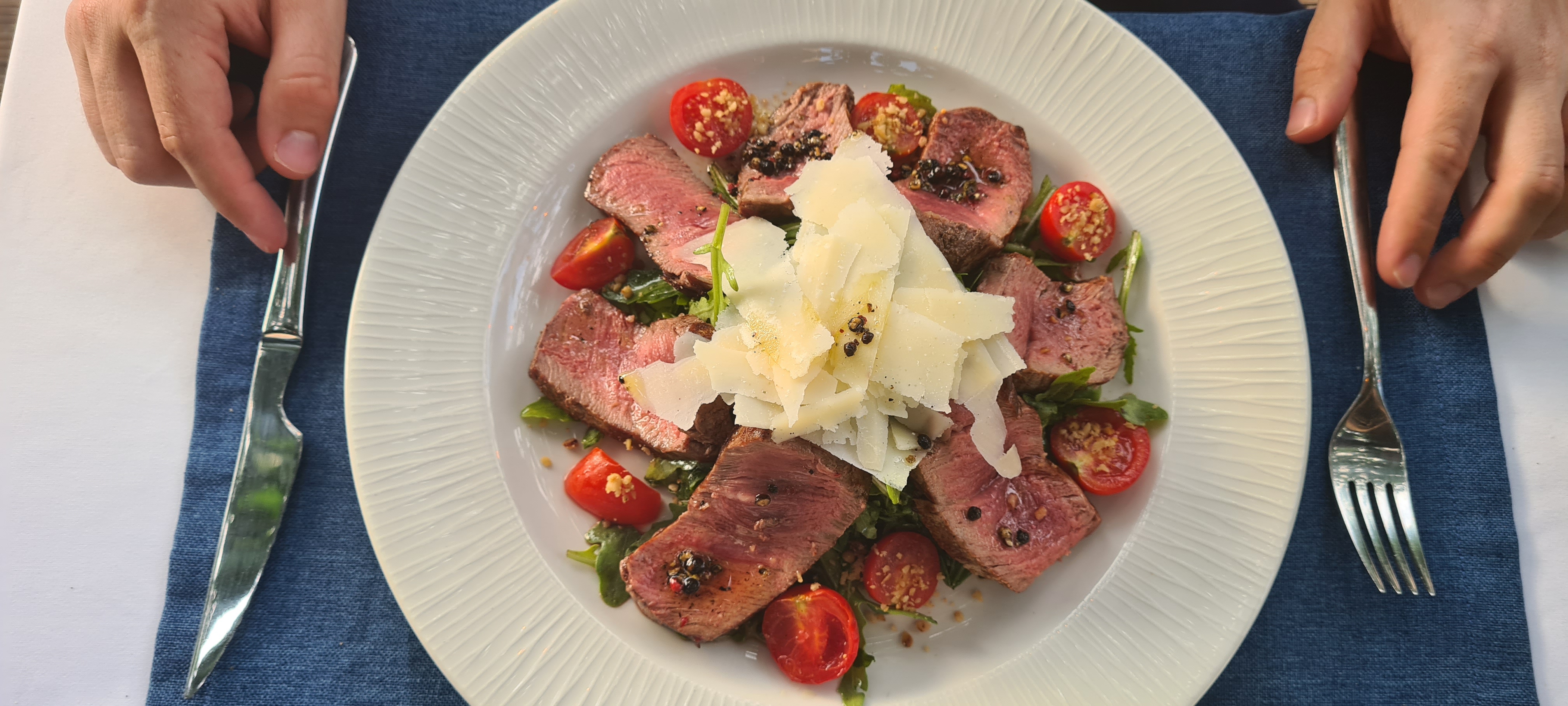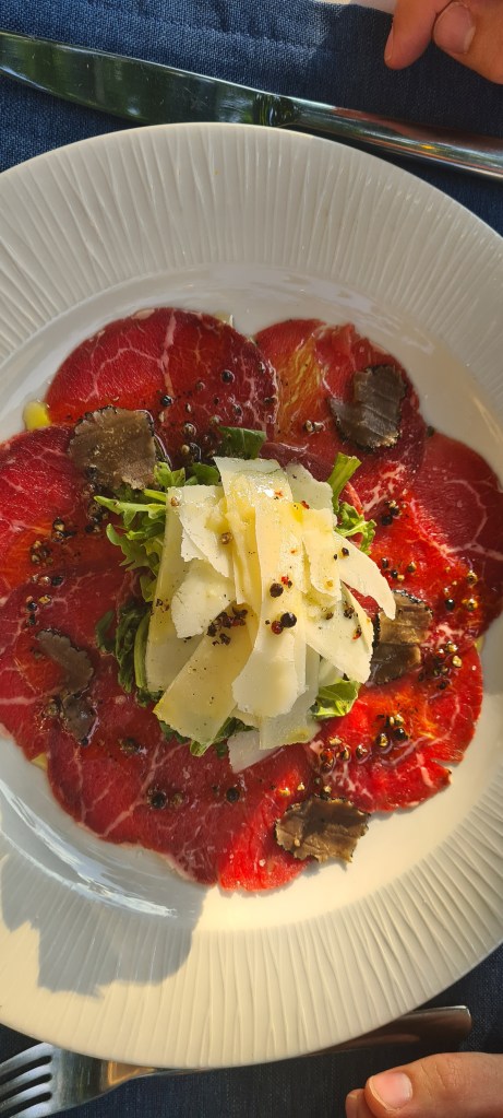 Für uns gab es Thunfischtatar, Carpaccio, Steaksalat, Steak Tagliatelle und Pistaziencheescake. Alles wirklich ein Gaumenschmaus (Falls ihr es noch nicht so ganz gemerkt habt: Ja, es war auch eine kulinarische Reise, denn wir wollten es uns essenstechnisch richtig gut gehen lassen…) Preislich waren wir hier bei 130 Euro, inklusive 4 Gläser Wein.