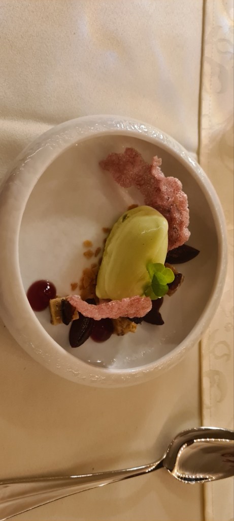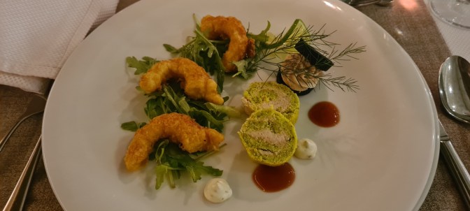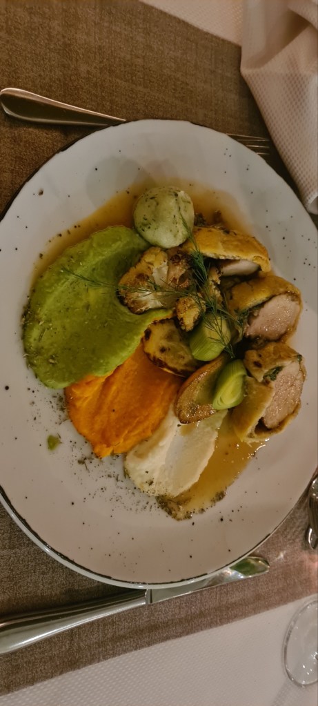 Nun ja….beim Fisch stand Garnelen in Tempura…..nur leider waren das keine Garnelen, sondern Krebsenersatz – den ich persönlich wirklich widerlich finde. Die Schweinemedaillons waren dann okay und die Nachspeise war auch in Ordnung. Aber alles in Allem war das Essen mehr ein Reinfall als sonst was. Egal, wir haben es mit Humor genommen und gehofft, dass das Essen auf dem Schloss am nächsten Tag wenigstens besser wird.