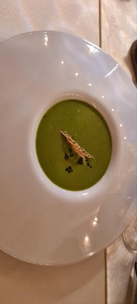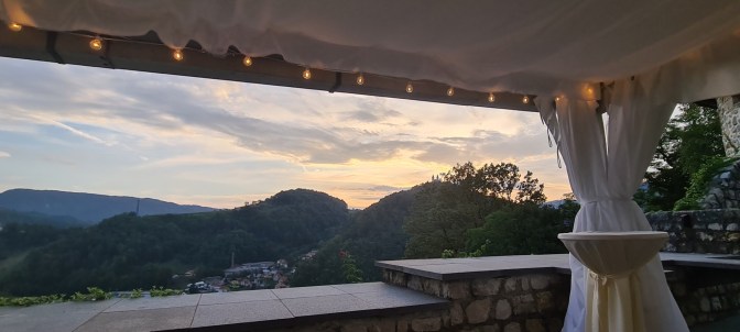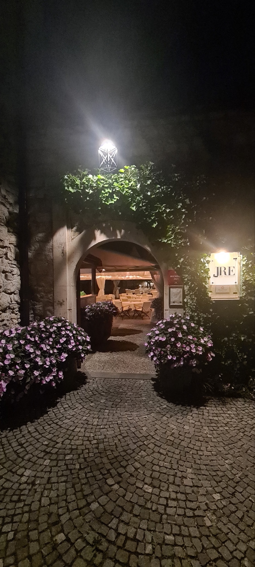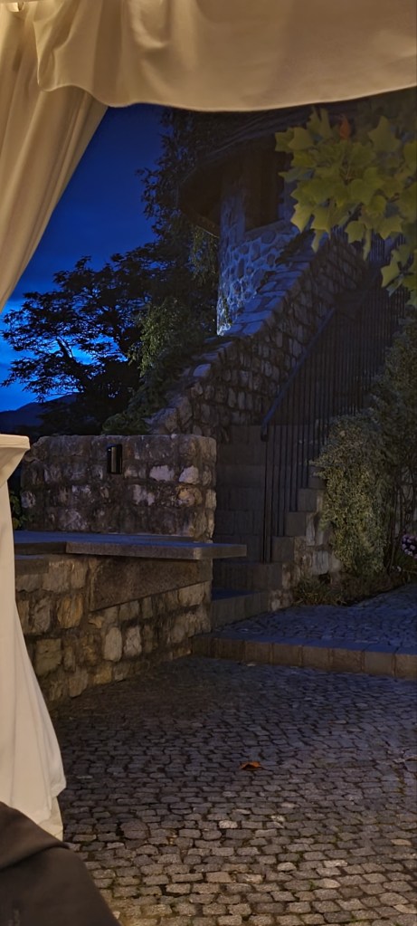 Also das Schloss Tabor liegt auf einer Anhöhe, die man zu Fuß erreichen kann, aber man hatscht schon schön bergauf – Damen mit hohen Schuhen wird abgeraten…auch die 15 Minuten, die im Hotel angeschrieben sind, sind etwas motiviert – wir haben länger gebraucht, aber es hat sich allemal ausgezahlt. Serviert wurde ein 5 Gänge Menü mit Weinbegleitung und wirklich atemberaubender Kulisse – das war wirklich ein Romantikessen!!