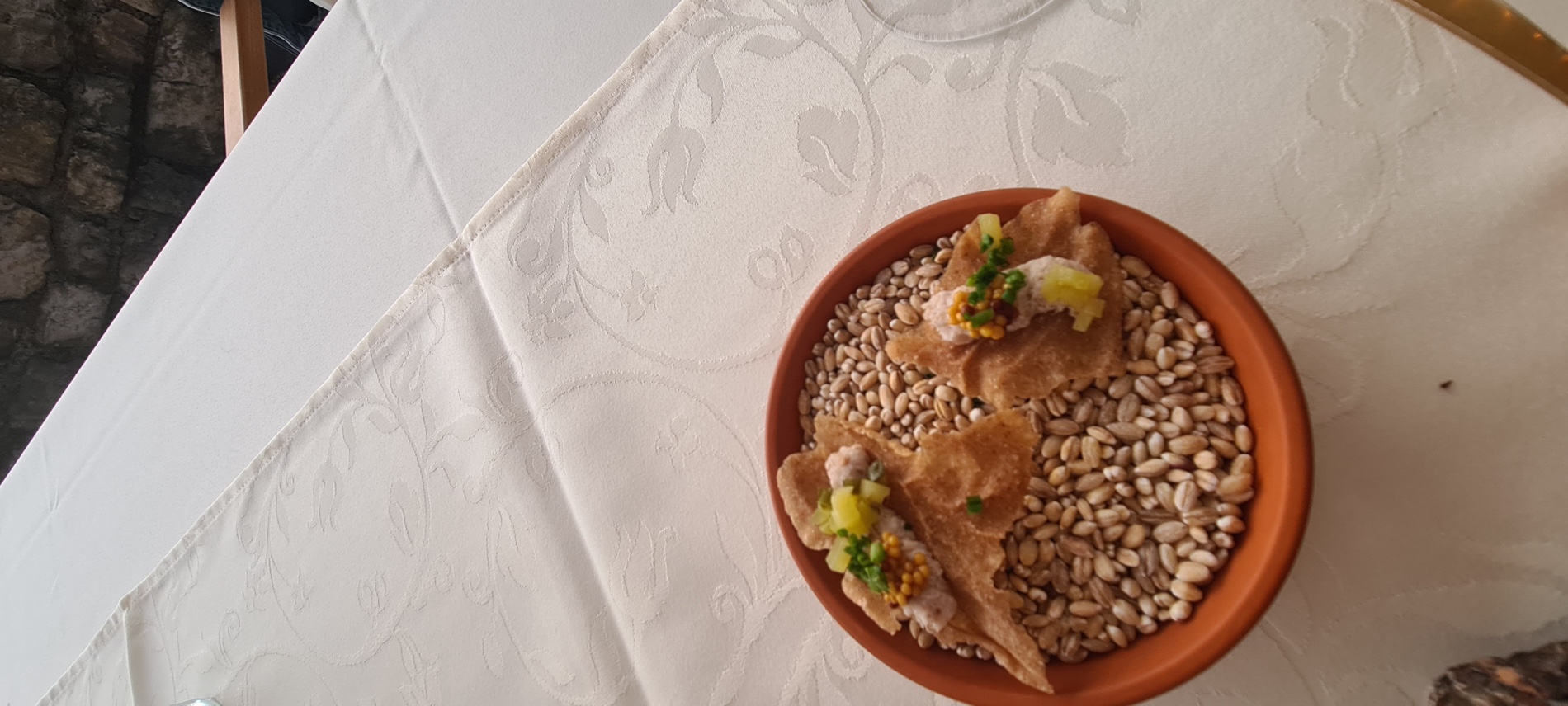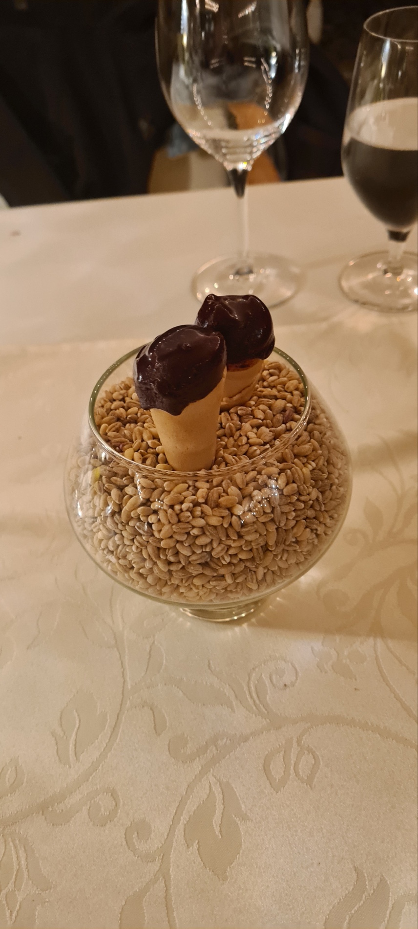 Am ersten Abend hatten wir unser Romantikessen im Hotel – also das ging komplett daneben…erstens saßen wir in einem finsteren Teil des Restaurants, wo wir eher das Gefühl hatten ausgesetzt zu sein. Dann kannte sich die Kellnerin mit den Weinen null aus und war auch wirklich desorganisiert. („Den Wein haben wir leider nicht kühl gestellt…“) Für unser Essen konnten wir aus zwei Menüs wählen – Vegetarier gibts bei denen keine….(Also wir sind selbst Fleischesser, aber ich fand es komisch, dass wir nicht einmal gefragt wurden….) Es blieb also die Wahl aus Fisch und Fleisch. Beim Fleisch war bei der Vorspeise ein Mortadello in verschiedenen Variantionen – gar nicht unseres – daher haben wir die Fischvorspeise und die Fleischhauptspeise genommen.