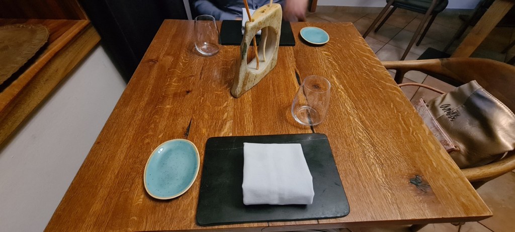 Also der Chef des Hauses ist sichtlich einem Horrorfilm entsprungen. Lange Haare, Schlachterschürze und Schlachtermesser – so wurden wir empfangen. Schüchterne Leute haben bei ihm kein leichtes Leben, denn er nimmt alles und jeden in die Mangel. Er sieht im Gegenzug aber auch alles was auf dem Tisch fehlt. (Sein Kellner wurde nicht nur einmal von ihm geschickt) Insgesamt haben wir dort 10 Gänge bekommen, und hatten zu fast jedem Gang ein Glaserl Wein. (Wir haben gesamt 260 Euro bezahlt – was wirklich schwer okay ist für 2 Personen und der Menge an Essen.)