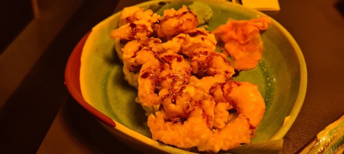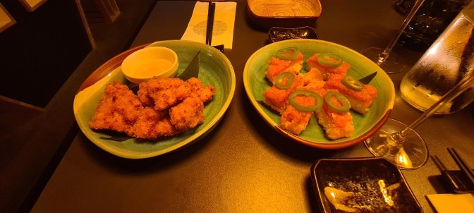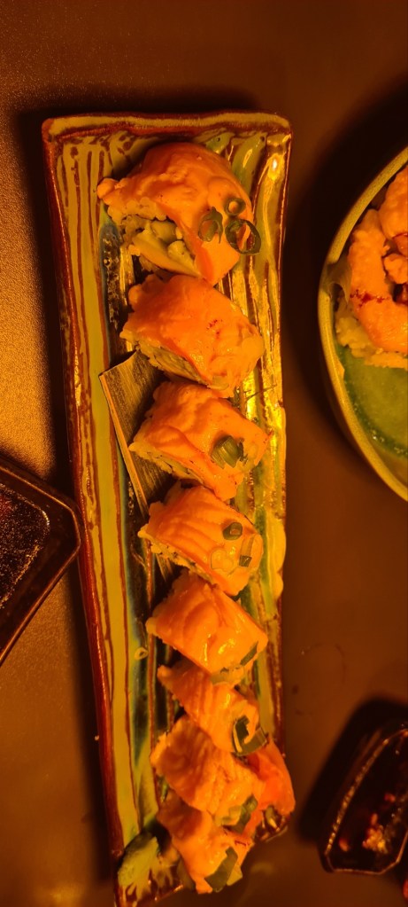 Die Speisekarte bietet alles was das Sushiherz begehrt von Sashimi bis Maki wird man hier fündig. Da wir – wie so oft – uns nicht entscheiden konnten, was wir denn nun nehmen sollten, haben wir ein Toshi Special Mix genommen, eine Menü Gangfolge mit verschiedenen Sushis, serviert nacheinander. Und als Vorspeise hatte ich Sushi mit geflämmten Lachs und mein Freund gebackene Hühnerstücke mit Mayo.