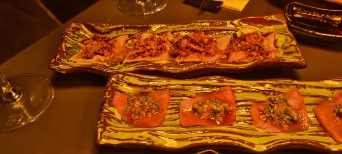 Weiter ging es dann mit den einzelnen Gängen – ich poste jetzt alle Fotos nacheinander, ich kann euch leider nicht mehr genau sagen was was war, weil ich da leider sehr vergesslich bin, und ich wollte auch nicht mit dem Handy daneben sitzen und alles mitschreiben. (Es tut mir auch leid, dass die Fotos so dunkel sind, aber in dem Lokal war sehr gedimmtes Licht :))