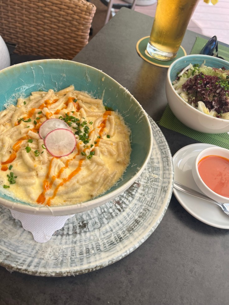 Das Lokal hat seine Speisen unterteilt in die jeweiligen Kategorien vegetarisch und vegan, aber eben auch glutenfrei. Von Suppe bis Kuchen bekommt man hier alles. Wenn man das Lokal betritt, dann sieht man gleich auf eine Küche, wo der Küchenchef fleißig zugange war. Bei unserem Besuch hatten sie auch eine Saisonkarte mit Eierschwammerl, und das hat mein Herz gleich höher schlagen lassen. Wir haben also, hungrig wie wir waren, gleich eine gute Bestellung aufgegeben. Mac’n’Cheese für meinen Freund und Eierschwammerlgulasch für mich. Es war wirklich ein Gaumenschmaus. So fein abgestimmtes Essen und man hat geschmeckt, dass es frisch gekocht war.