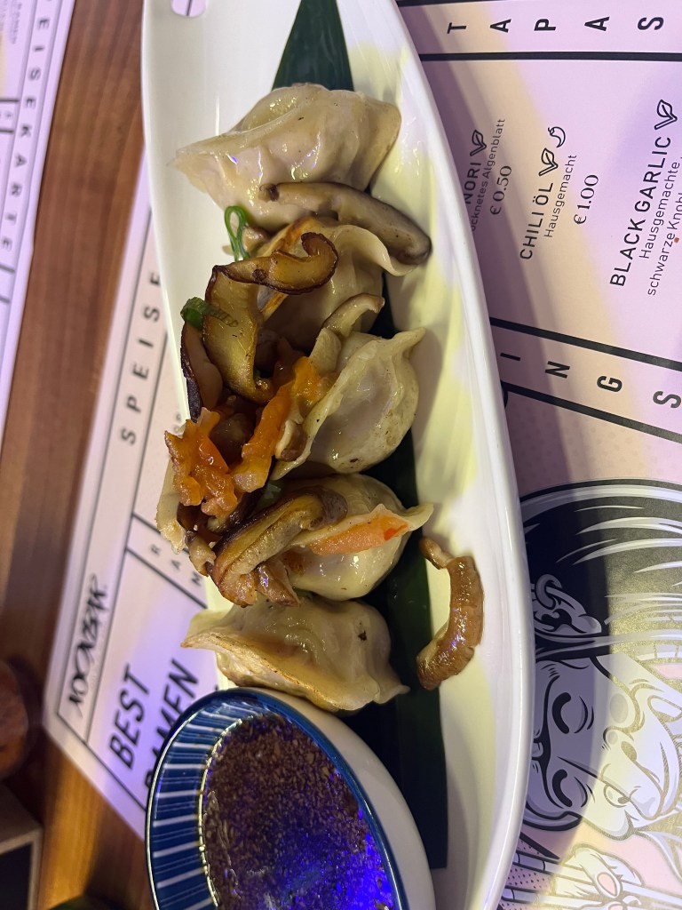 Es gibt eine kleine Auswahl an Vorspeisen und dann Ramen oder Donburi. Ich habe mich für Gyoza und ein Shoyu-Ramen entschieden und wurde nicht enttäuscht. Die Suppe war kräftig, das Fleisch butterweich und das Ei noch leicht weich. Genau so wie ich mir das vorgestellt habe.