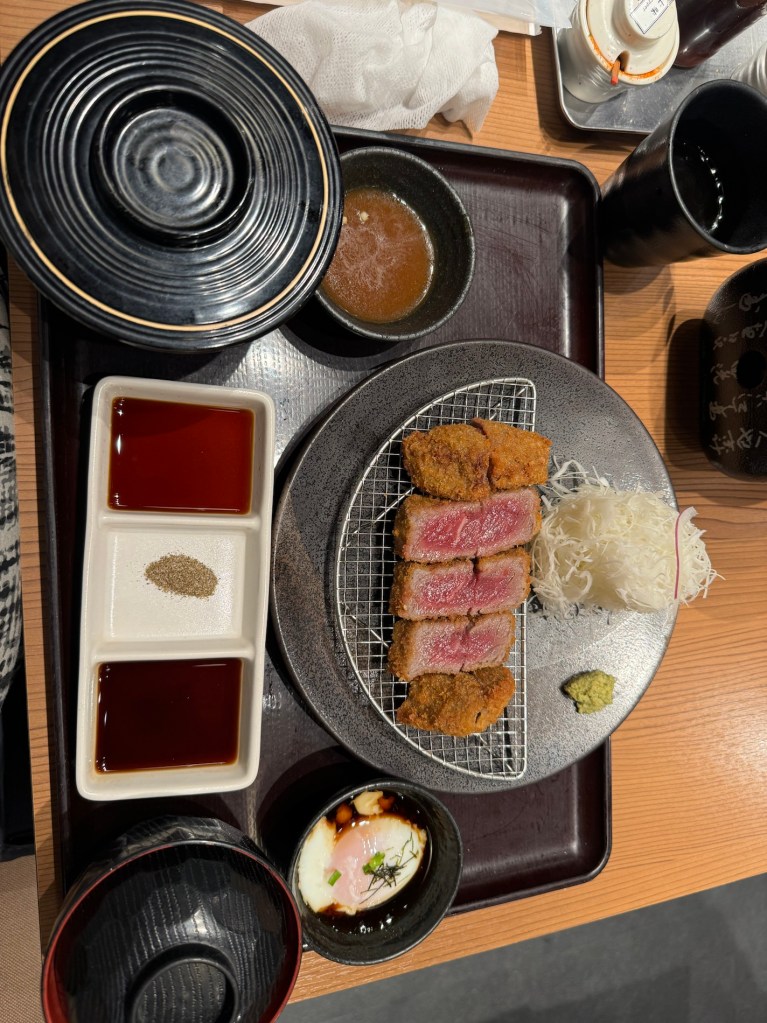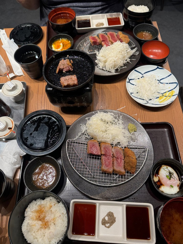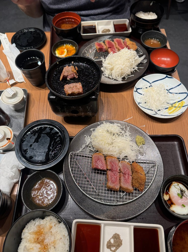Wir sind letztendlich in einen Katsu Laden gefallen, der wirklich ausgesprochen gut war. Das Rindfleisch kann man, wenn man will, auf den Grill werfen und nochmal nachbraten, muss man aber nicht. Das Fleisch war extrem zart und die Bestellung kommt hier meistens in einem Set. Reis und Suppe kann man beliebig gratis nachbestellen 🙂 das Essen hat uns nicht ganz 40€ für beide gekostet.