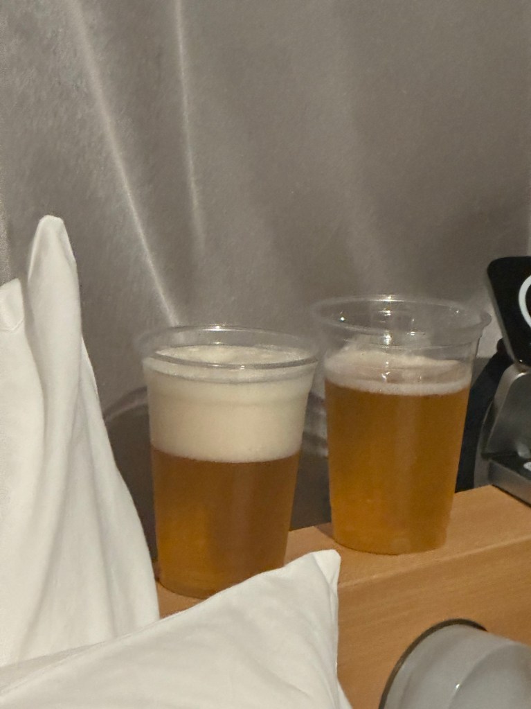Nach einem lockeren Spaziergang nach Hause haben wir unsere Wäsche geholt….die jetzt überall im Zimmer hängt, weil der Trockner nicht zu gebrauchen ist. Auf die Luftfeuchte und Wärme im Zimmer stoßen wir jetzt nochmal an (großer Bier – Automat im Hotel – 2,5€ 😀 Beer Heaven) und dann geht es ab in die Federn – die leider sehr hart sind, aber wir machen das beste draus.